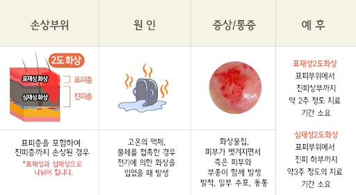 - 2도 화상: 피부의 표피와 진피가 모두 손상된 경우로, 물집이 명확히 보이며, 통증이 상당히 심합니다.