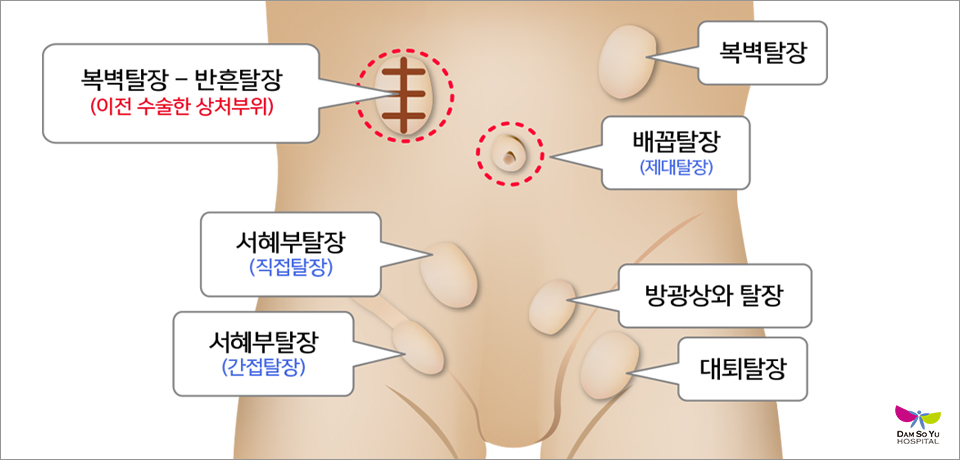 - 복벽 탈장: 복부의 강한 압력에 의해 복벽이 뒤틀리면서 발생합니다. 주로 비만이나 임신으로 인해 위험성이 증가합니다.