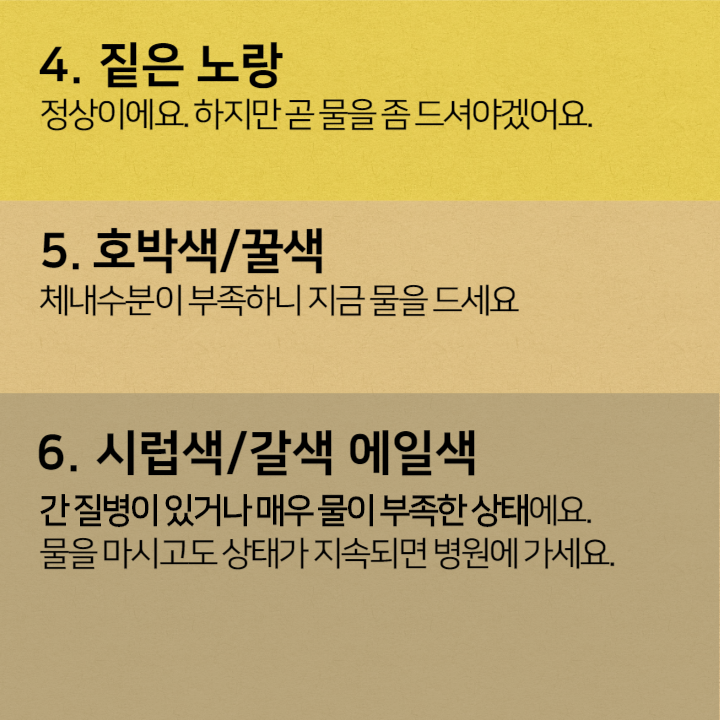 - 수분 섭취 확인: 색깔이 진하다면 물을 더 많이 마시세요.